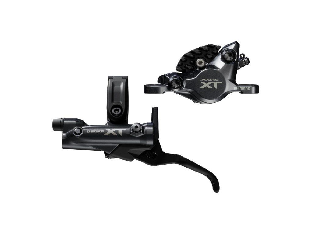 Hydraulická kotúčová brzda Deore XT M8200. Skladá sa z páky BL-M8200, strmeňa BR-M8200 a hadičky SM-BH90. Brzdy sú naplnené minerálnym olejom s nízkou viskozitou a odvzdušnené. Objímka páky kompatibilná pre montáž radenia s úchytom I-Spec EV. Brzdové platničky G05A.