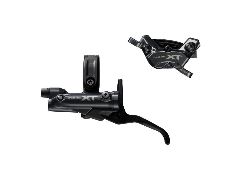 Hydraulická kotúčová brzda Deore XT M8220. Skladá sa z páky M8200 a strmeňa M8220 (4-piestny) a hadičky BH90. Brzdy sú naplnené minerálnym olejom s nízkou viskozitou a odvzdušnené. Objímka páky kompatibilná pre montáž radenia s úchytom I-Spec EV. Brzdové platničky P03A.
