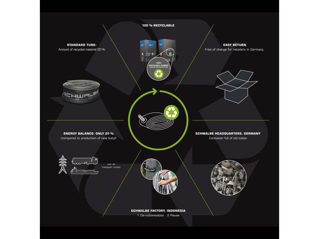 Každá duša Schwalbe je 100% recyklovateľná. Bez straty kvality môžeme pri výrobe nových duší použiť recyklovaný materiál. V našej továrni sme vyvinuli špeciálny proces devulkanizácie a už niekoľko rokov sa ukazuje, že veľmi úspešné. Aktuálne každá štandardná duša od Schwalbe pozostáva z 20% z recyklovaných starých duší.