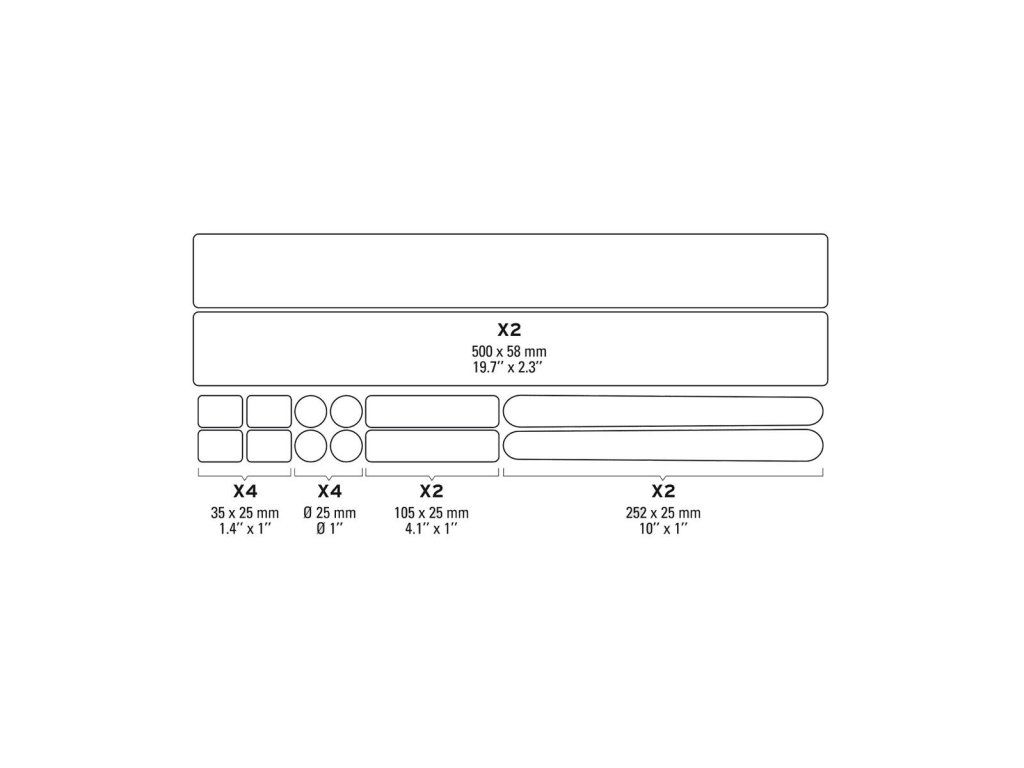 - Zloženie: 1x ochrana spodnej rámovej trubky 500 X 58 mm / 1x ochrana hornej rámovej trubky 500 x 58 mm / 2x ochrana zadnej stavby 252 X 25 mm / 2x ochrana kľúk 105 x 25 mm / 4x nálepka 35 X 25 mm / 4x nálepka Ø 25 mm.