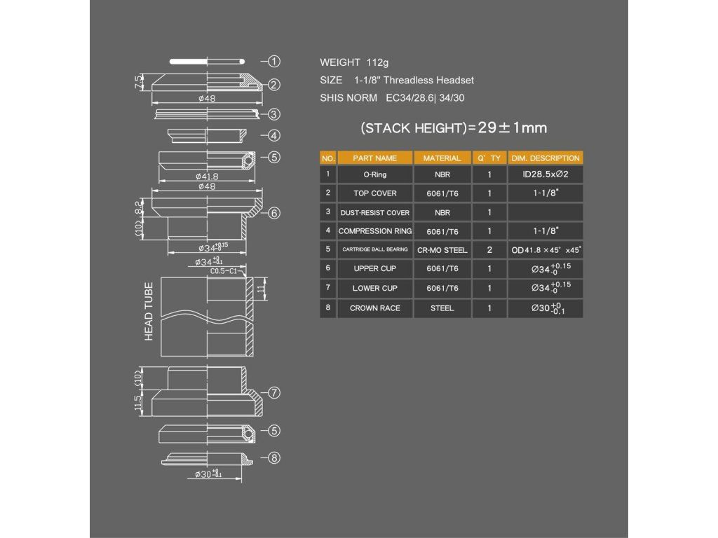 Hliníkové hlavové zloženie s oceľovou korunkou určené pre vidlice s 1-1/8" (28,6 mm) krkom bez závitu. Zapuzdrené guľôčkové ložiská poskytujú extrémne hladký chod a dlhú životnosť bez servisného zásahu. Súčasťou balenia je horný kryt so skrutkou a ježkom. Zloženie je určené pre MTB, ATB a Trekking bicykle.
