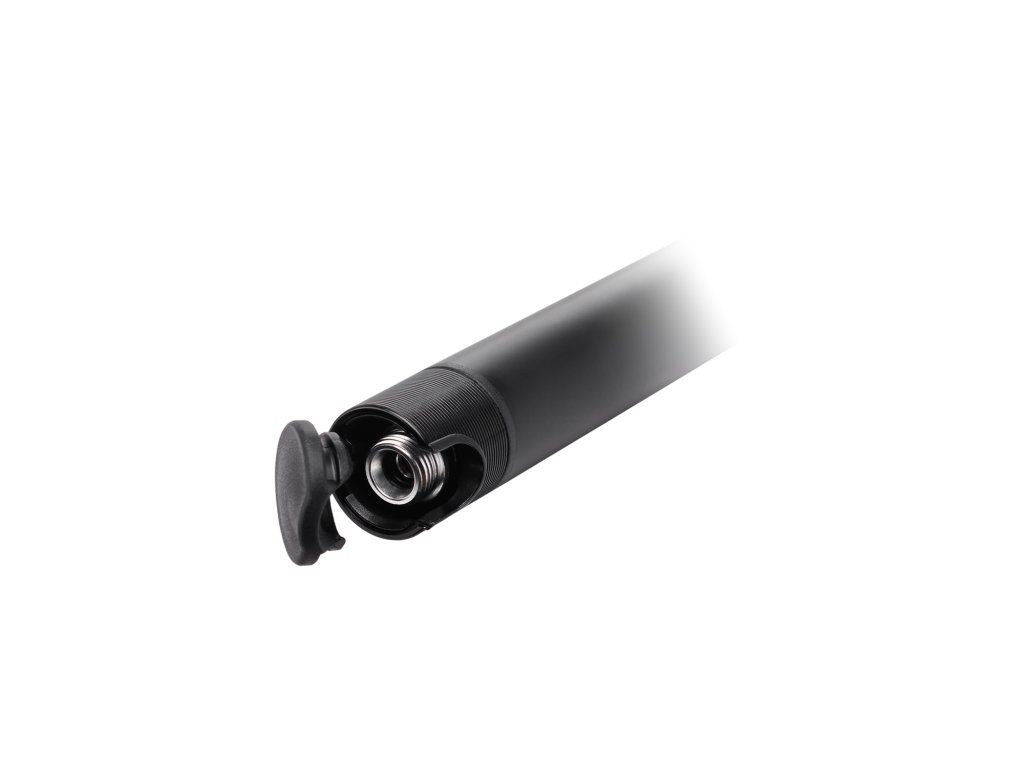 Hliníková CNC mini hustilka s výsuvnou hadičkou; Max. tlak: 120PSI; Otočný ventil hlavy hustilky - jednoduché otočenie na závit; Hadička sa po vysunutí zalamuje o 90 stupňov a jednoduchšie sa tak manipuluje pri hustení; Kompaktná veľkosť a nízka váha ideálna pre montáž pod košík na fľašu; Typ ventilu: auto/presta; Súčasťou je držiak hustilky; Dĺžka 19 cm; Farba: čierna
