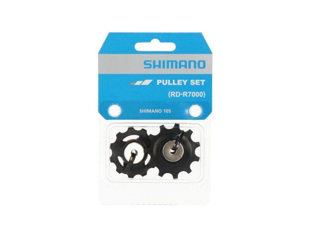 Napínacia a vodiaca kladka pre prehadzovačku Shimano 105 R7000. Sada kladiek obsahuje presné ložiská, ktoré zabezpečujú nízke trenie a hladký chod.