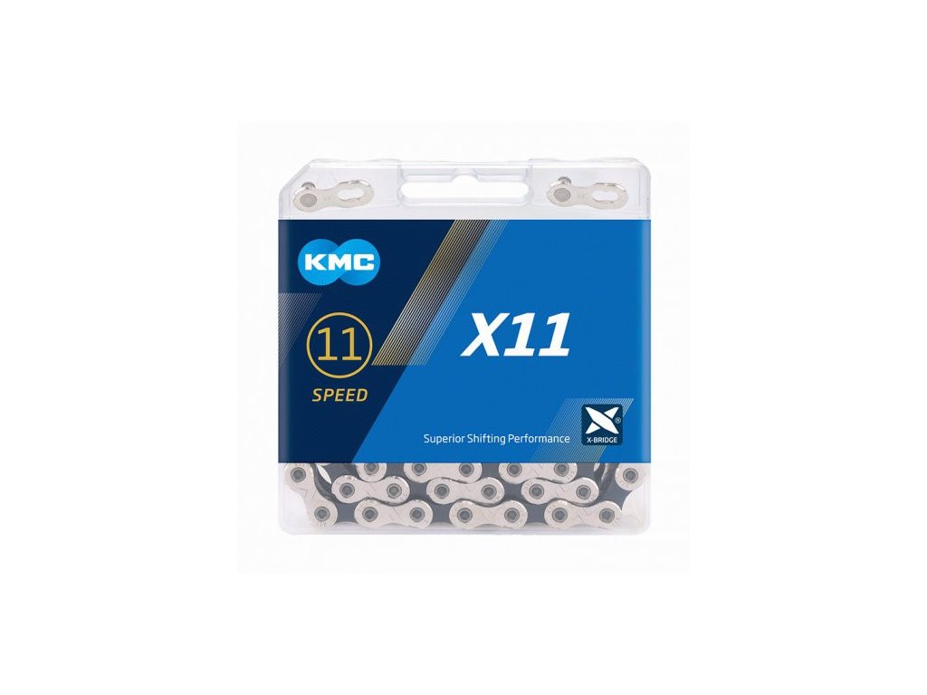 11-rýchlostná reťaz na bicykel KMC X11 v strieborno-šedom farebnom prevedení je dodávaná vrátane rýchlospojky missing link.