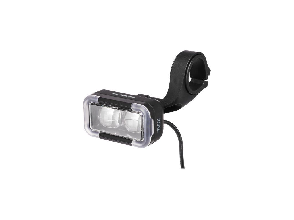 Predné svetlo DOX pre E-bicykle; Svietivosť: 80 lux obrysové /120 lux diaľkové (250 lm); Dve prémiové LED diódy s veľkými šošovkami poskytujú široký rozptyl svetelného lúča (120 lux); Obrysové osvetlenie po obvode svetla zabezpečí dokonalú viditeľnosť zo strán (80 lux); Podvesná montáž na riadidlá na objímku 31,8mm (35mm); Možné namontovať aj na mostík vidlice; Certifikované StVZO; Napájanie: 6/12V, 8-58V (kábel s 3 vetvami, červená-obrysové / žltá-diaľkové / čierna-zem; červená a žltá sa zapája spolu); Vodoodolnosť: IPX5; Balenie obsahuje aj montáž na vidlicu a spojku na káble; Rozmer: 69x43x38 mm; Váha: 40g
