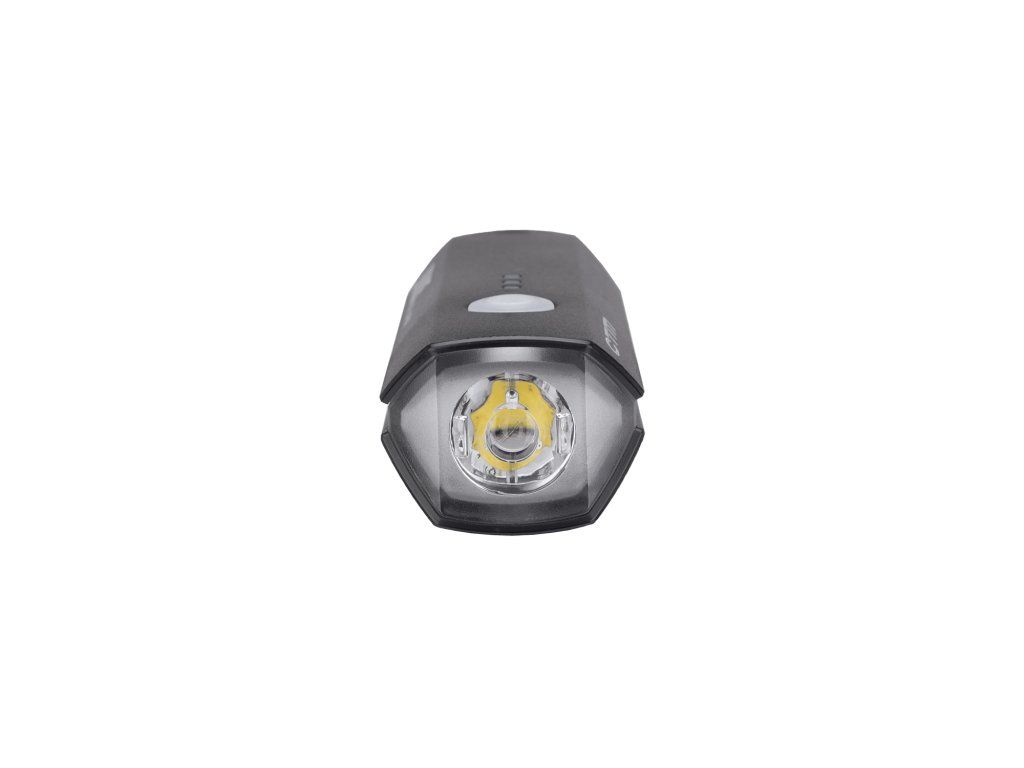 Predné svetlo s bielou výkonnou LED diódou a možnosťou dobíjania cez USB-C; Svietivosť: 550 lm; Ľahká hliníková konštrukcia s vylepšeným odvodom tepla; Funkcie: stále svetl: 25% (9h) - 50% (3,5h) - 100% (1,5h) - blikanie - pulzovanie; Prepínanie medzi svetlom a blikaním dvojklikom vypínača, vypnutie svetla podržaním; Funkcia pamät režimov; Vodoodolná konštrukcia; Lítiová batéria 18650 s 3.7V 1800 mAh s dobou nabíjania 4,5 hodiny a ochranou prebitia/podvybitia; Indikátor stavu batérie; Balenie obsahuje USB-C kábel; Rýchla montáž bez náradia; Rozmer: 104x30x39 mm; Váha: 108g; Farba: čierna