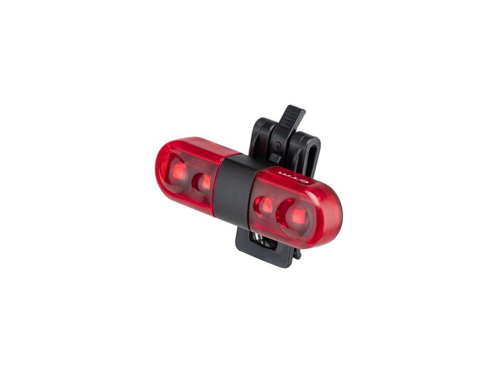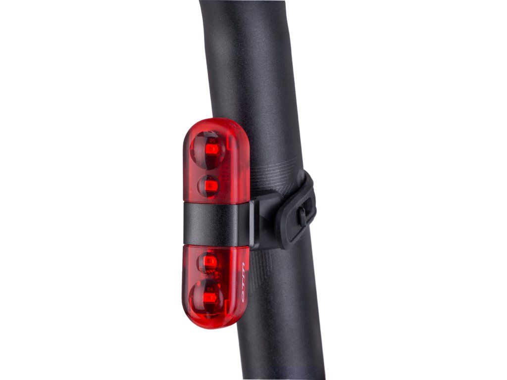 Zadné osvetlenie s možnosťou dobíjania cez USB; Štyri vysokosvietivé červené LED diódy; Svietivosť: 23lm; Funkcie: svetlo: 100% - 50% - blikanie - pulzovaie - výstražné blikanie; Li-Po batéria 3.7V 300 mAh s dobou nabíjania 3 hodiny a ochranou prebitia/podvybitia; Prepínanie medzi režimami kliknutím vypínača, vypnutie svetla podržaním; Veľký rádius viditeľnosti; Vodeodolná konštrukcia IPX4; Indikátor stavu batérie; Balenie obsahuje USB kábel a klip na pripnutie; Rozmer: 76x23x21 mm; Rýchla montáž bez náradia; Farba: čierna"
