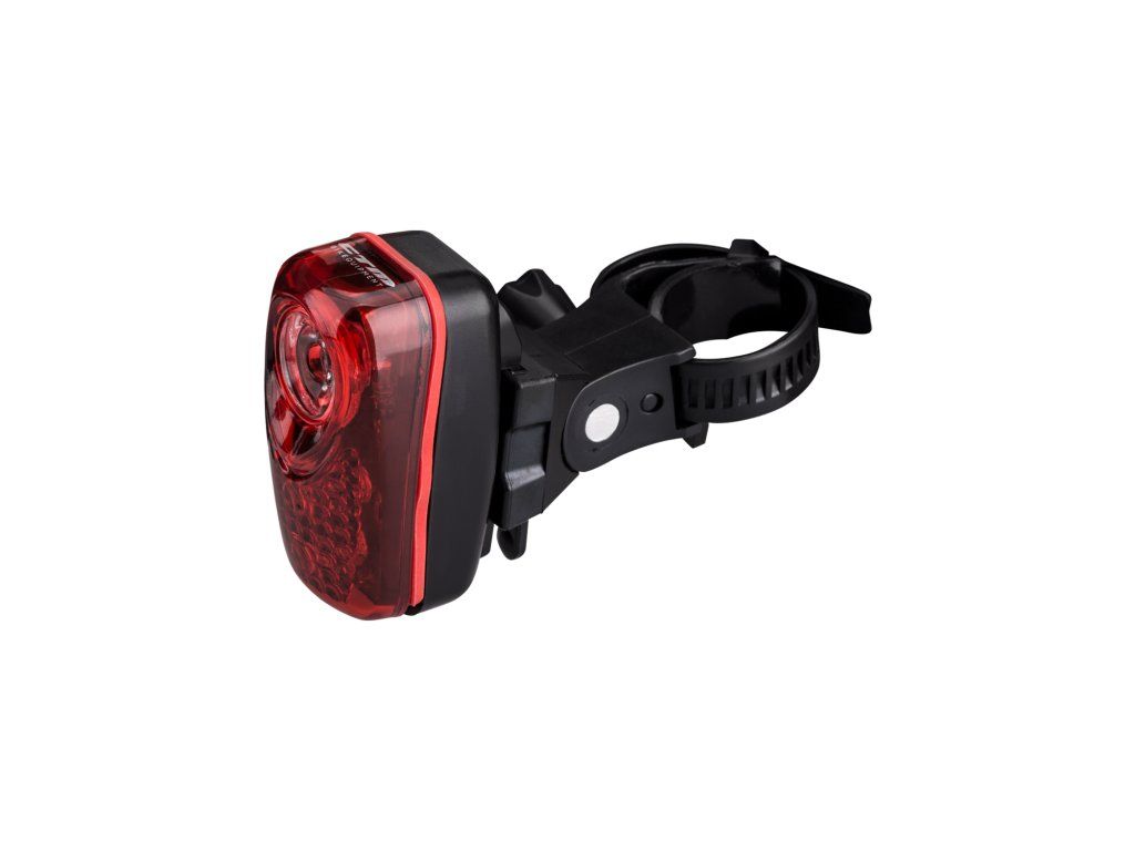 Zadné osvetlenie s tromi červenými LED diódami, z toho jedna o výkone 0,5 W; Funkcie: blikanie - svieti iba jedna - stále svetlo; Uchytenie objímkou na sedlovú trubku; Balenie obsahuje 2 ks AAA batérie; Farba: čierna"