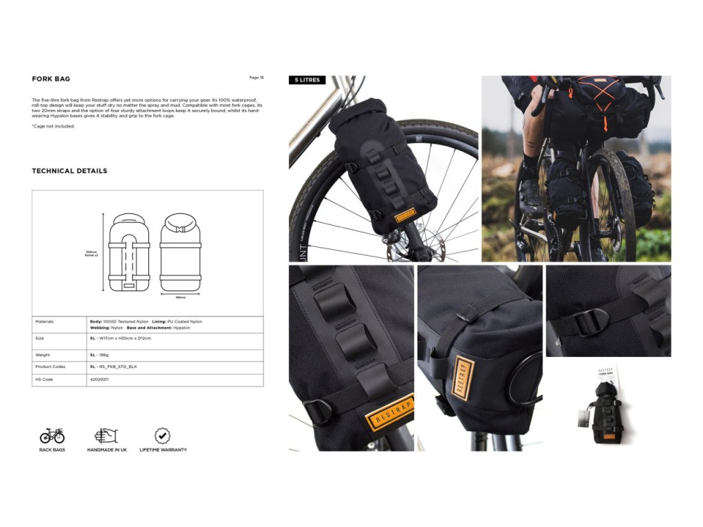 5-litrový Fork Bag od Restrap poskytuje ešte viac možností na prenášanie výbavy. Jeho 100% vodotesný dizajn s rolovacím uzáverom ochráni vaše veci pred vodou, blatom a nečistotami. Taška Fork Bag je plne kompatibilná s držiakom Carry Cage a väčšinou ostatných držiakov na vidlice. Je vybavená dvomi 20 mm popruhmi a štyrmi pevnými slučkami na upevnenie, ktoré zabezpečujú jej stabilitu. Pevný spodný diel z materiálu Hypalon dodáva taške stabilitu a priľnavosť k držiaku.