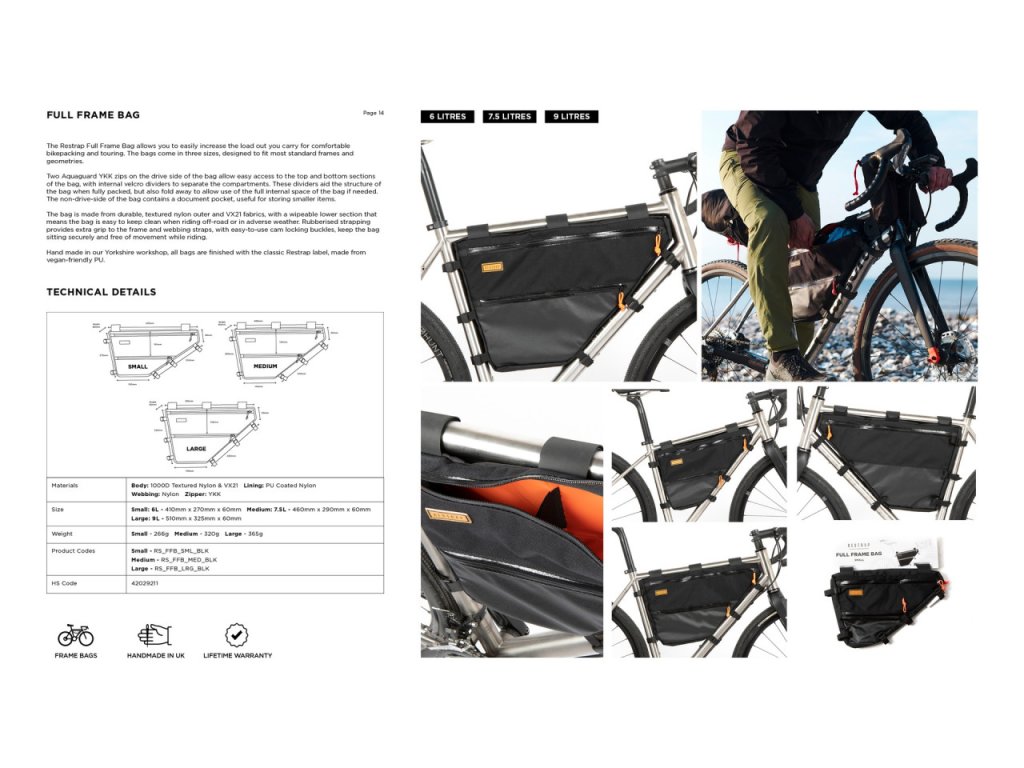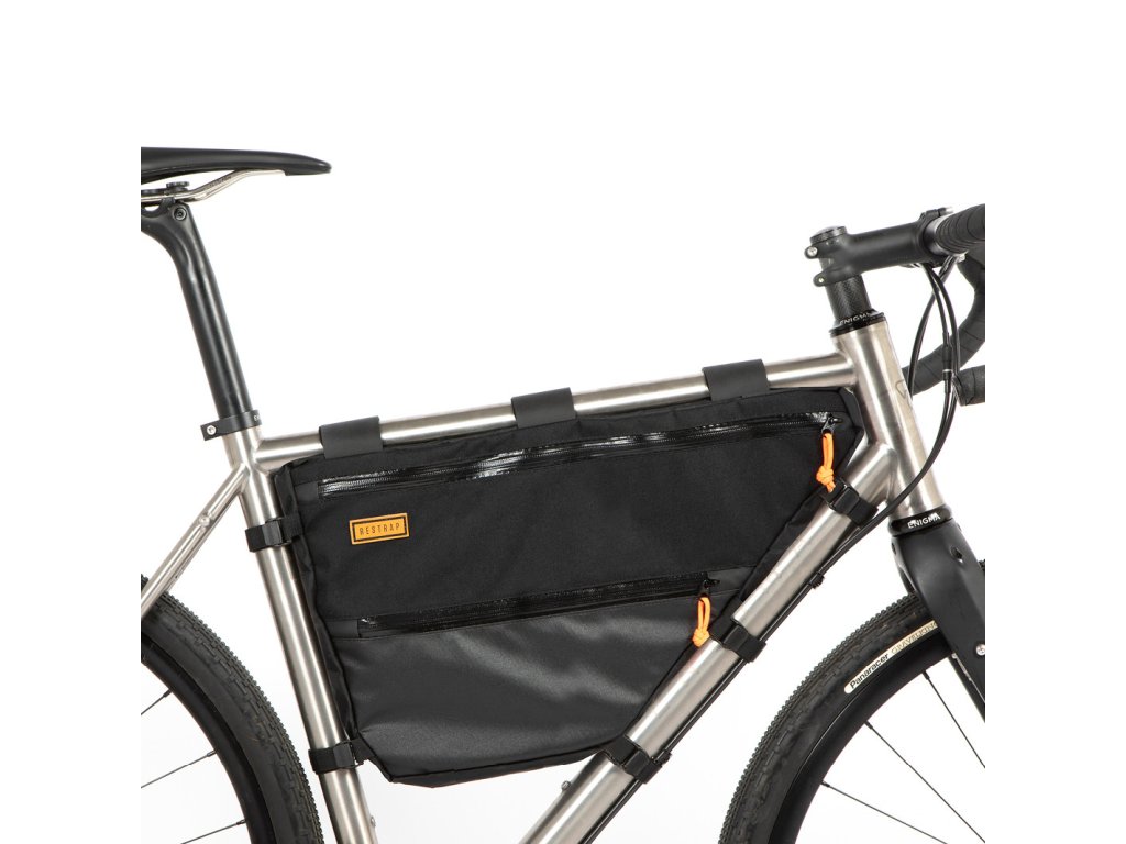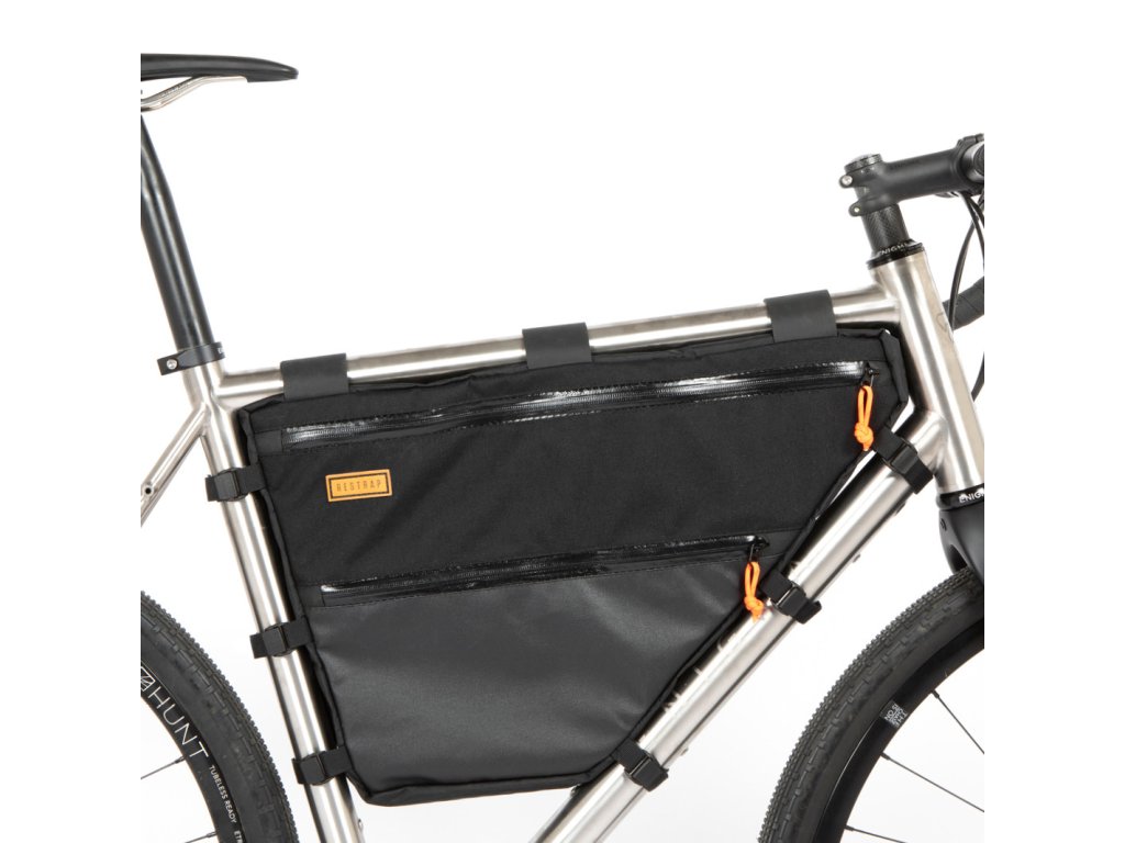 Restrap Full Frame Bag umožňuje jednoducho zvýšiť nosnosť pre pohodlný bikepacking a cestovanie. Tašky sú k dispozícii v troch veľkostiach, navrhnuté tak, aby sa hodili na väčšinu štandardných rámov a geometrií.