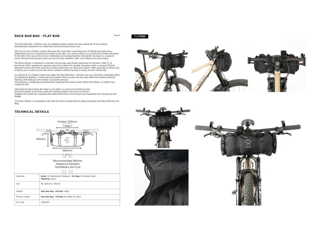 Race Bar Bag - Flat Bar je navrhnutá pre tých, ktorí cestujú naľahko a rýchlo, ale nechcú robiť kompromisy v oblasti funkčnosti. Obsahuje optimalizovanú plochú riadidlá a plne vodotesnú 7-litrovú dvojitú rolovaciu tašku s lemom GripTight pre dodatočnú stabilitu.