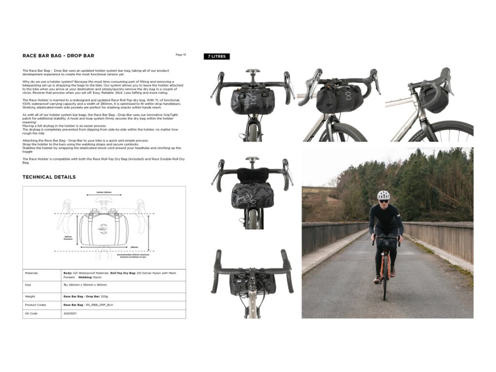 Race Holster je spárovaný s prepracovaným a modernizovaným Race Roll-Top suchým vakom. S objemom 7 litrov a 100% vodotesnosťou má šírku 280 mm a je optimalizovaný na použitie s cestnými riadidlami typu drop bar. Elastické sieťované bočné vrecká sú ideálne na odkladanie občerstvenia na dosah ruky.