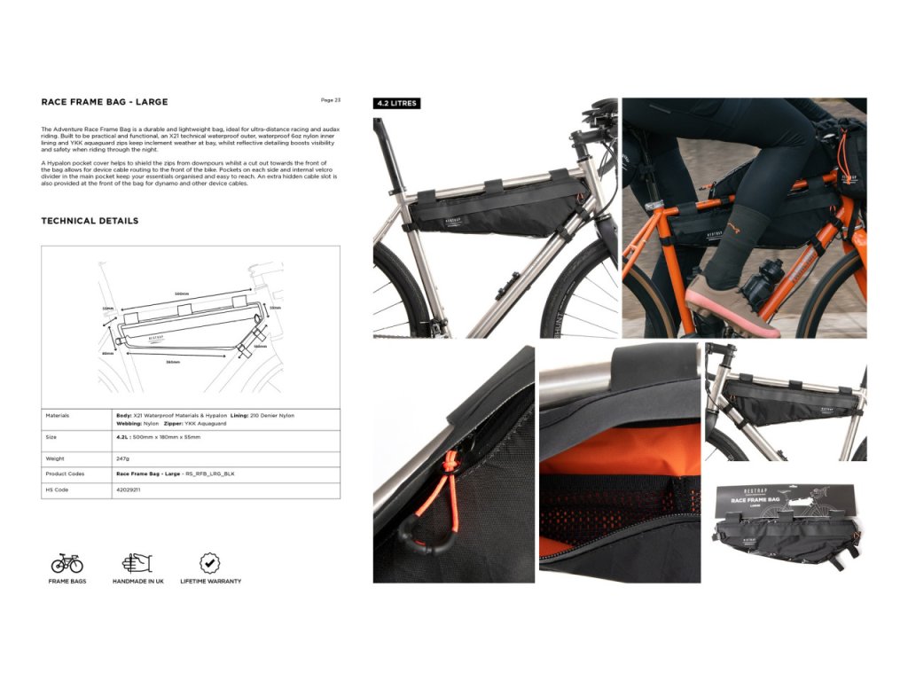 Adventure Race Frame Bag je odolná a ľahká taška, ideálna pre ultradlhé závody. Navrhnutá tak, aby bola praktická a funkčná, s technickým X21 vodotesným vonkajším materiálom, vodotesnou 6oz nylonovou podšívkou a YKK Aquaguard zipsami, ktoré chránia pred nepriaznivým počasím, zatiaľ čo reflexné detaily zvyšujú viditeľnosť a bezpečnosť pri nočnej jazde.