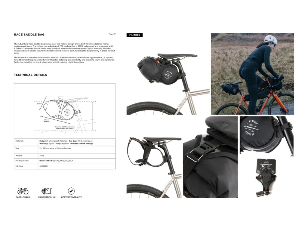 Puzdro má špeciálny 7 litrový vak, ktorý je 100% vodotesný a je zabezpečený magnetickou prackou Fidlock™, ktorá sa ľahko nastavuje aj pri nosení rukavíc. Nylonové popruhy, Hypalon pásy a penové bloky zabezpečujú puzdro okolo sedlovky, čím držia tašku pevne na mieste.