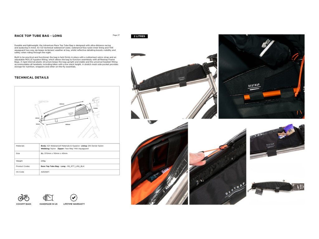 Navrhnutá tak, aby bola praktická a funkčná, taška je pevne upevnená pomocou gumového suchého zipsu a nastaviteľného MOLLE Hypalon uchytenia, ktoré umožňuje taške bezproblémové fungovanie s všetkými rámovými taškami Restrap. Pevná plastová vnútorná štruktúra udržiava tašku vzpriamenú a stabilnú, bočné vrecko z elastickej sieťoviny poskytuje úložisko na výživu, obaly a ďalšie nevyhnutnosti počas jazdy.