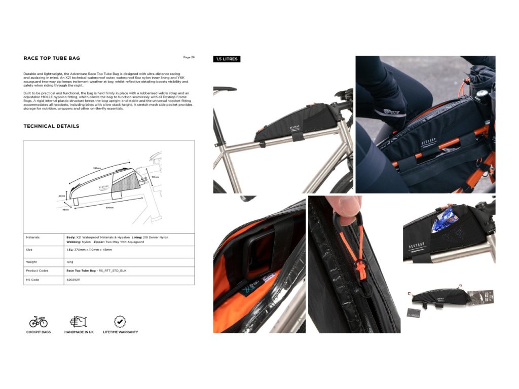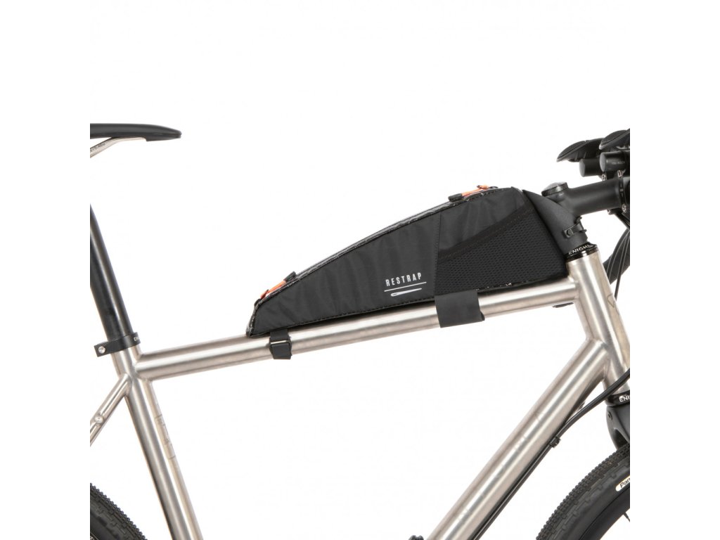 Navrhnutá tak, aby bola praktická a funkčná, taška je pevne upevnená pomocou gumového suchého zipsu a nastaviteľného MOLLE Hypalon uchytenia, ktoré umožňuje taške bezproblémové fungovanie s všetkými rámovými taškami Restrap. Pevná plastová vnútorná štruktúra udržiava tašku vzpriamenú a stabilnú, bočné vrecko z elastickej sieťoviny poskytuje úložisko na výživu, obaly a ďalšie nevyhnutnosti počas jazdy.