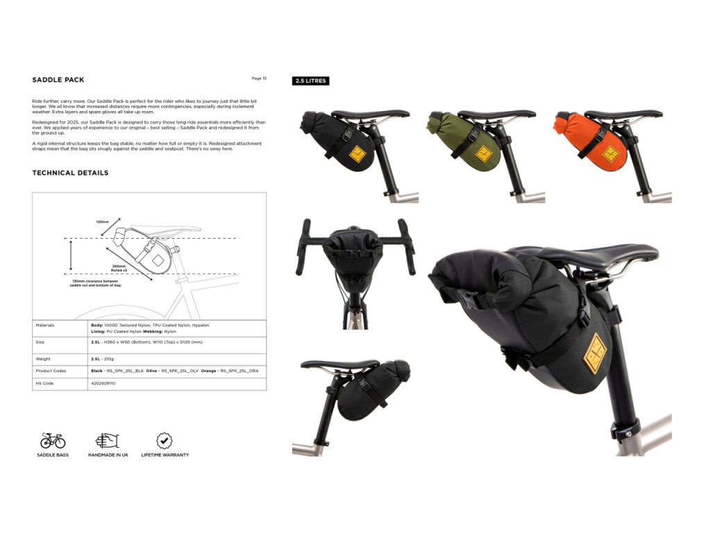 Bez potreby držiakov alebo skrutiek sa taška pripevní na akýkoľvek bicykel za pár sekúnd. Super ľahká, 2,5-litrová vodotesná sedlová taška je vyrobená z textúrovaného nylonu. S nylonovou podšívkou a podlepenými švami disponuje rolovacím uzáverom, ktorý poskytuje odolnú ochranu pred nepriaznivým počasím.