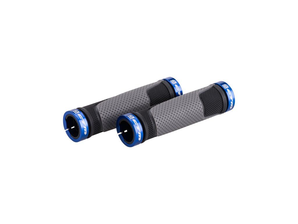 Gumené dvojzložkové gripy plastovom tele; Lock-on systém upevnenia; Farba: šedo-čierna/modré objímky; Dĺžka 130 mm"
