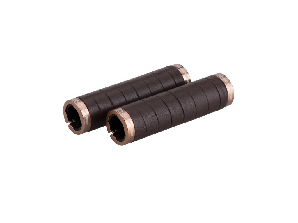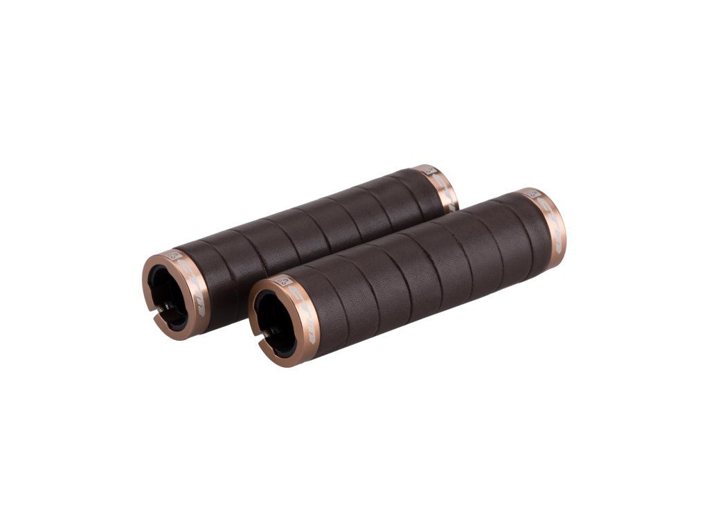 Koženkové gripy na plastovom tele; Lock-on systém upevnenia; Farba: hnedá/zlaté objímky; Dĺžka 130"