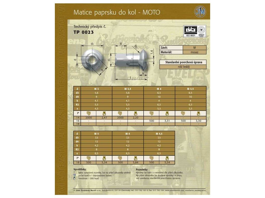 Velomatička(nipel)s priemerom 3 mm a dĺžkou 16mm pre výplety motoriek a kárových kolies. Priemer hlavy: 9 mm Rozmer 4-hranu nipla 4,6 mm Materiál: mosadz Povrchová úprava: lesklé niklovanie