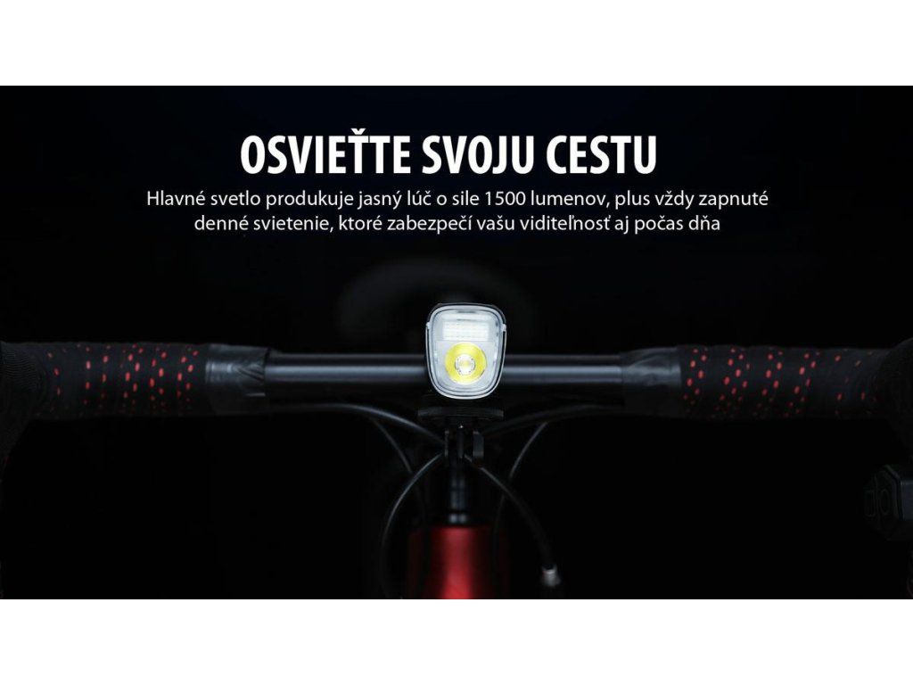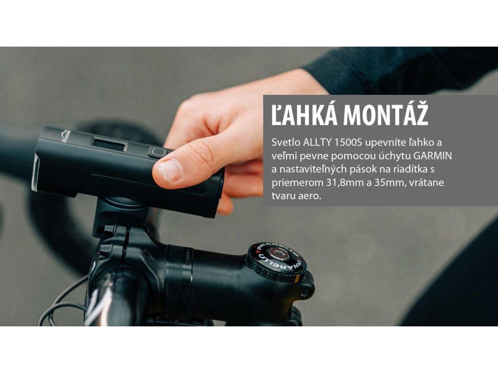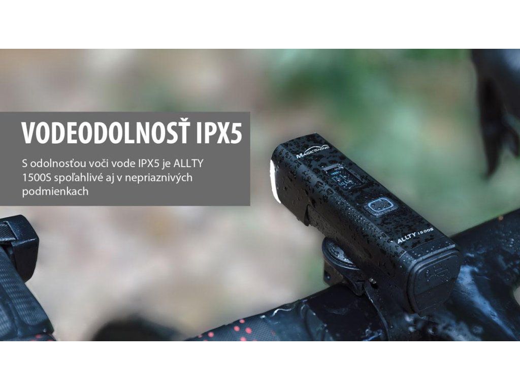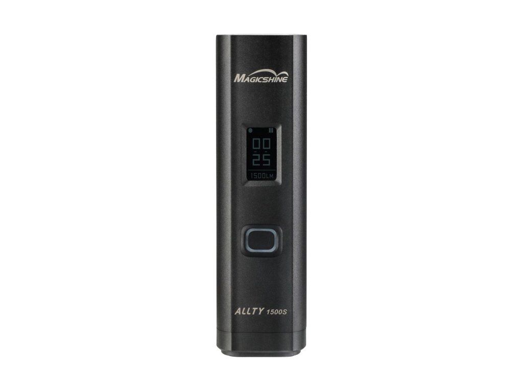 Predné svetlo ALLTY 1500S je špeciálne navrhnuté pre každodenné použitie ako pre horskú, tak aj cestnú cyklistiku, s možnosťou upevnenia na riadidlá alebo prilbu. Svetlo v klasickom a elegantnom dizajne je vybavené 2 funkčnými jednotkami, hlavným svetlom, využívajúcim vysokovýkonnú LED s maximálnym výkonom 1500 lúmenov a neustále zapnutým denným svetlom pre zaistenie maximálnej bezpečnosti ako cez deň, tak aj v noci. Odnímateľná 5000mAh batéria, dobíjateľná cez USB-C port zaručuje rýchle nabíjanie a podporuje prevádzkovú dobu až 31 hodín. OLED displej na tele svietidla zobrazuje okrem zvoleného režimu svietenia aj aktuálny stav batérie a čas do úplného vybitia. Keď sa batéria vybije, spustí sa režim nízkej spotreby, aby svetlo zostalo zapnuté a bezpečne vás priviedlo domov. Súčasťou balenia je bezdrôtové diaľkové ovládanie na zapnutie/vypnutie svetla, výber intenzity a zmenu režimu osvetlenia. ALLTY 1500S je kompatibilný aj s aplikáciou Magicshine, ktorá podporuje až 20 vlastných režimov a umožňuje zvoliť intenzitu osvetlenia od 1 % do 100 %. Aktiváciou senzora okolitého svetla z aplikácie bude svetlo schopné automaticky upravovať intenzitu počas dňa. Vďaka vodotesnosti IPX5 je ALLTY 1500S spoľahlivý aj v nepriaznivom počasí.