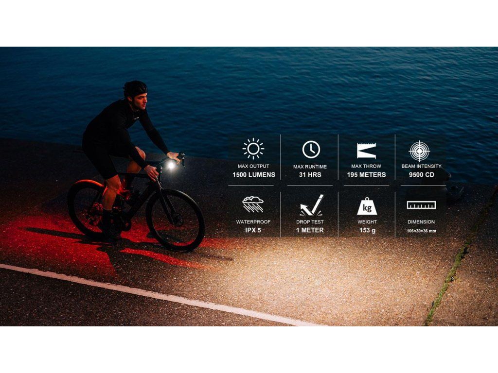 Max výkon: 1500 lm; Intenzita lúča: 9500CD; Batéria: 3.6V 5000 mAh; Max prevádzkový čas: 31 hod; Doba nabíjania: 3 hod (5V 2A); Nabíjačka: USB-C; Vodeodolnosť: IPX5; Systém upevnenia: Štvrťotáčkový držiak Garmin; Rozmery: 106x30x36 mm; Váha: 153 g;